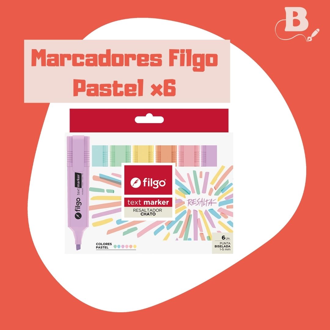 Amplía tu colección de estudio con el set de 6 resaltadores Filgo Text Marker en colores pastel. Estos tonos modernos son ideales para destacar textos en libros, apuntes y cuadernos sin saturar la vista. Su tinta de secado rápido y la punta biselada te garantizan una marcación prolija y eficiente. Perfectos para estudiantes y profesionales que buscan organización visual.